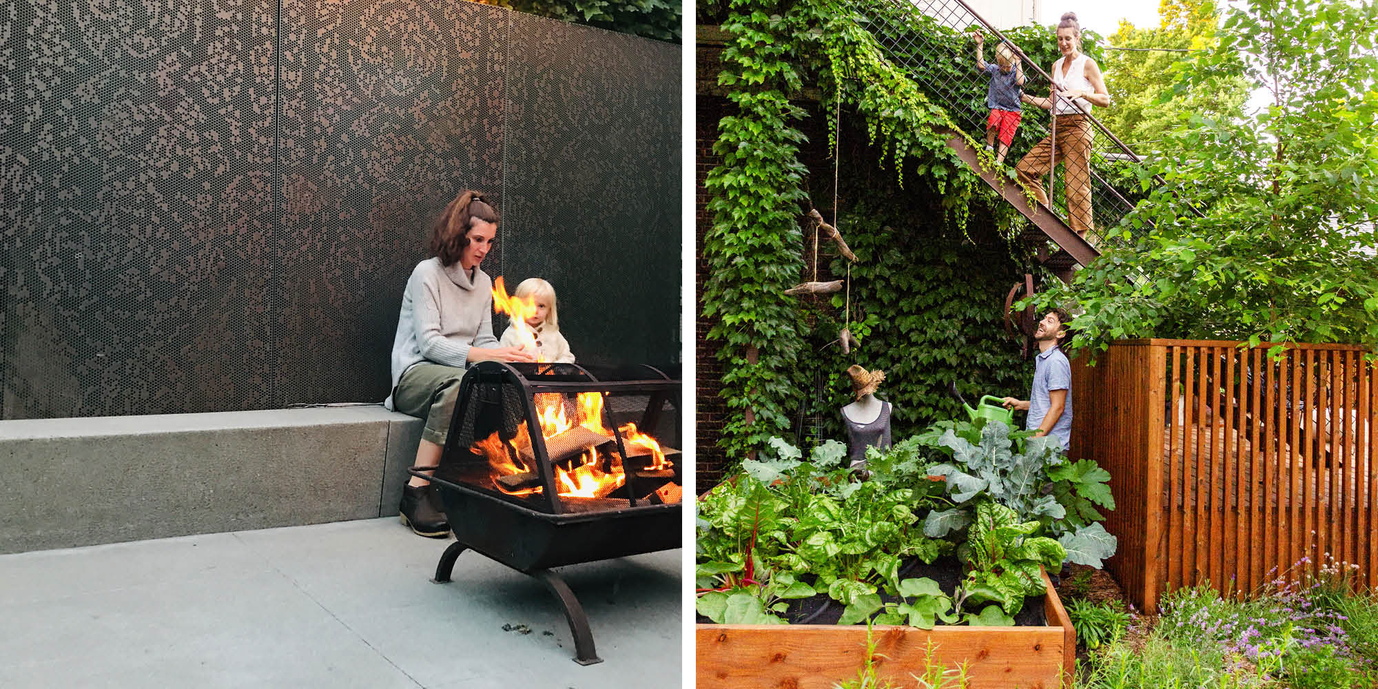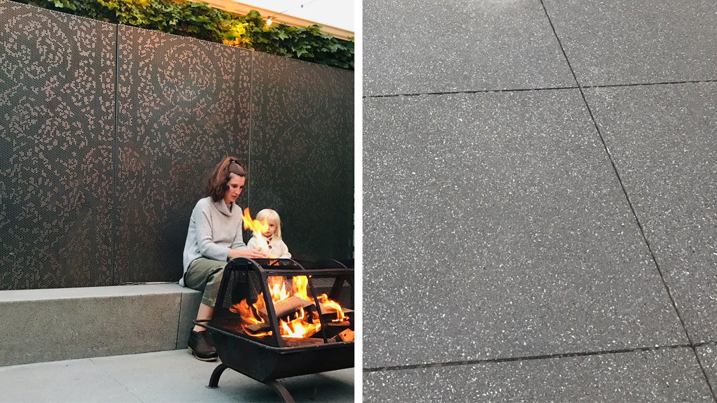 Our landscaping project started with demolition, we removed everything so that we might have a clean slate. We needed to be efficient and thus built the cedar deck, followed by the concrete, turf, and meadow successively. The project was accented via the insertion of three recycled elements. The first was a collection of perforated copper screens, reclaimed from downtown Minneapolis’s Westminster Church. The screens has been designed by my former landscape architecture firm and has been procured during a recent renovation that would have required their disposal. Next was the utilization of two precast benches, placed on the concrete patio as an invitation for informal gathering. Lastly, leftover pieces of wood from the deck construction were repurposed to build a dinning table.